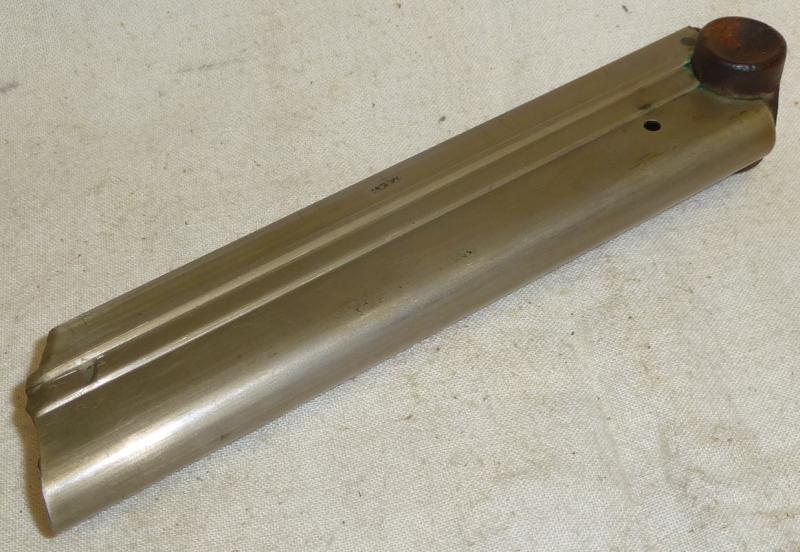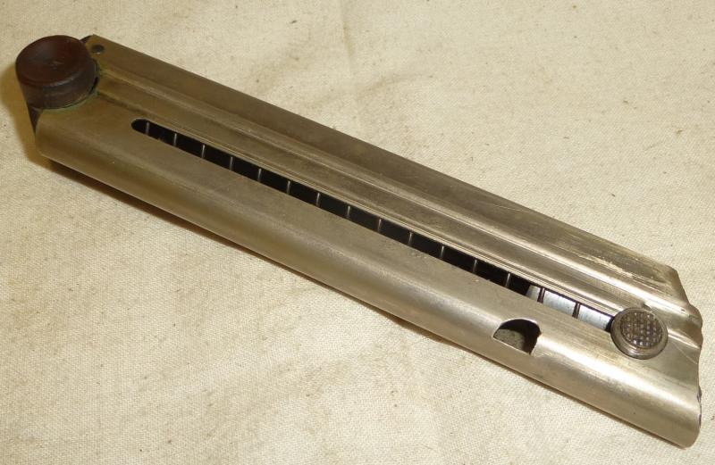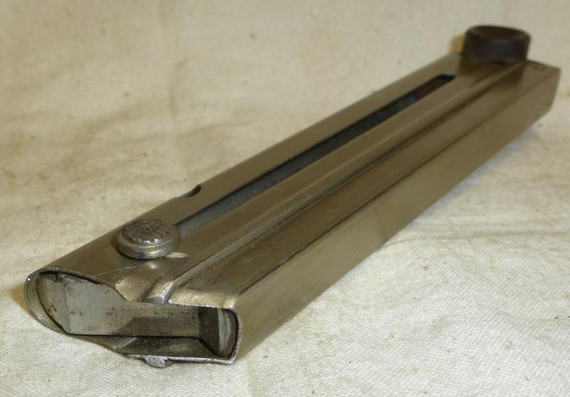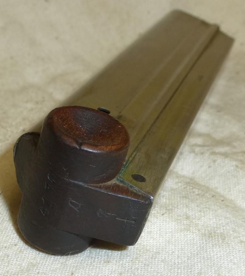 This is an extremely fine original WWI wood base magazine. It has what appears to be the original factory sealed finish to the casing. No signs of excessive use all edges are sharp and clean. Lovely clear markings to the base 4130 together with + denoting spare mag acceptance stamp and makers mark. This is a true gem of a magazine one for the collector