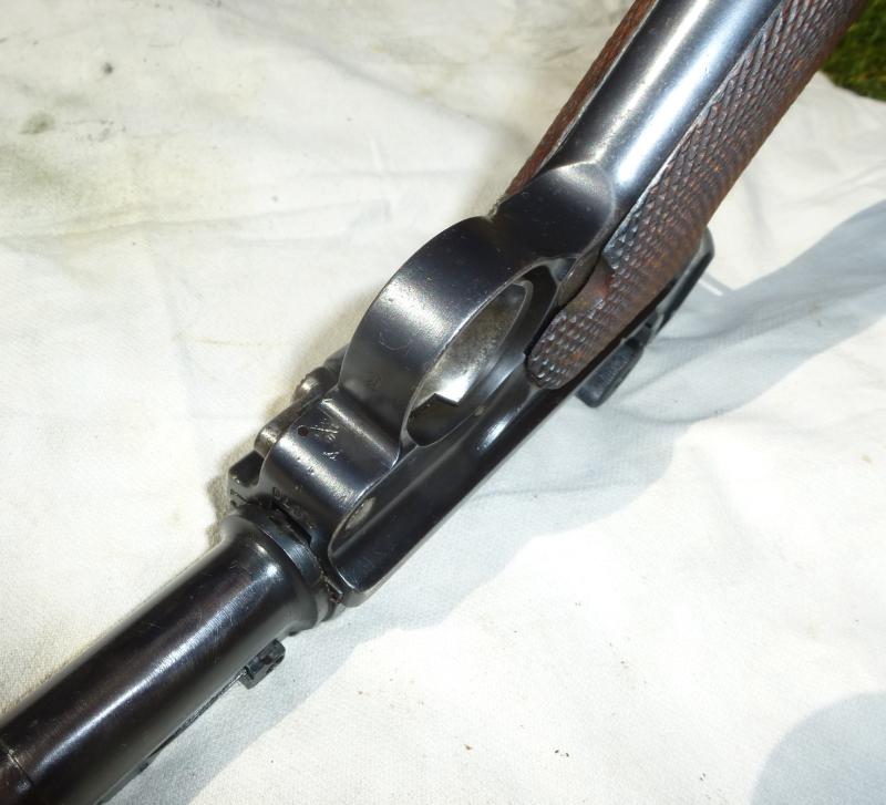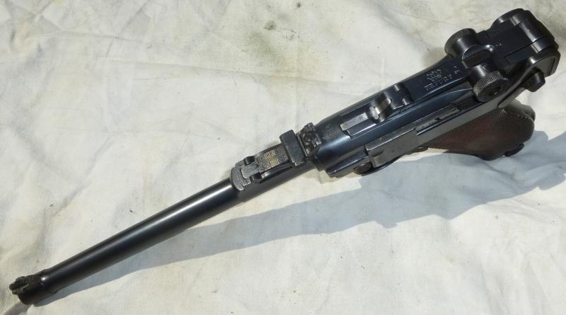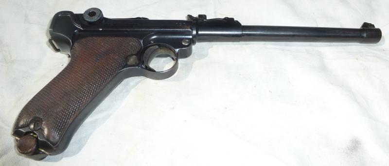 This is a rarer version Luger the Artillery type. This one is dated nice and early 1914 by Erfurt it is all matching numbered, the barrel may have been replaced in its life as the deacting of the barrel has obliterated the number it looks like the sight is matched to the pistol. A scuff to the grip may have been made to remove a German marking ? In lovely condition with minor pitting and age wear, the trigger still retains some of the straw gold finish. Complete with wood base magazine sadly not matched numbered 2450, pistol numbered 8870.