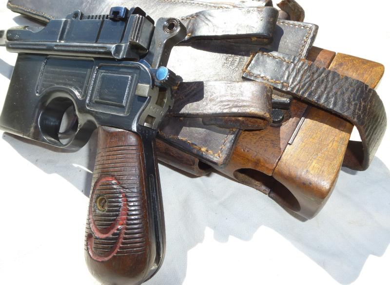 This is an ultra rare Mauser C96 Red Nine automatic pistol. This is a museum quality piece, it was at one point part of a collection sold some years ago by a collector of C96`s. First to point out is that this was "ghost marked" with the deactivation proof stamp in that the stamps have been made internally so a not to be seen to spoil the looks and finish. The blued finish is almost 100% with only minor holster wear. It has the correct Red Nine grips with correct notches 25. The hammer is the correct one for this model with NS on the rear. All matching serial numbers.
