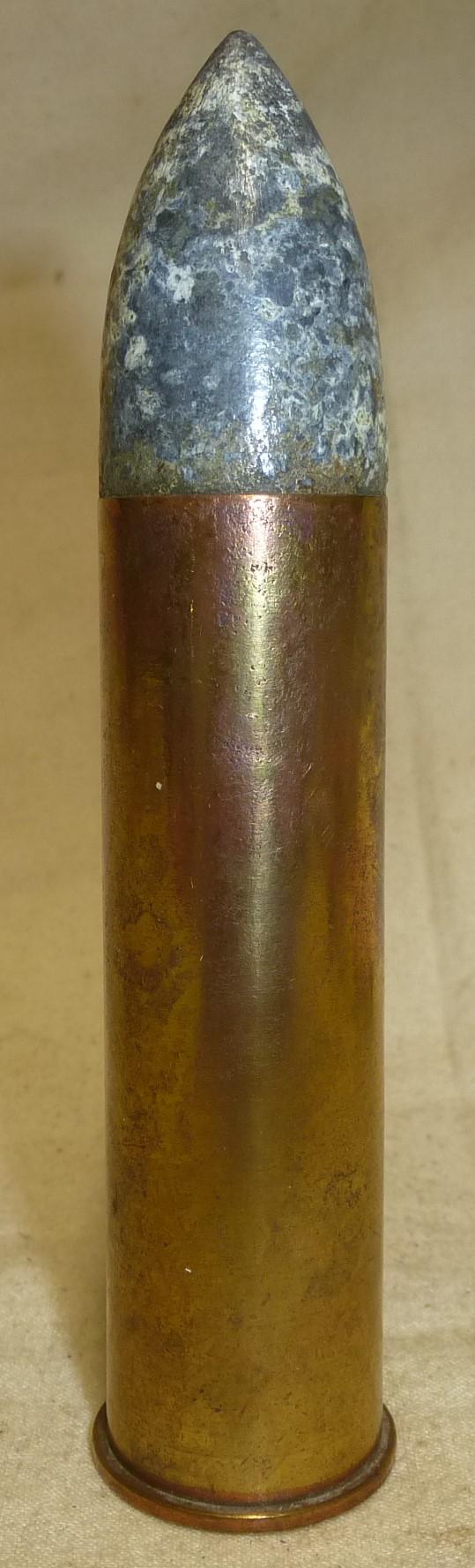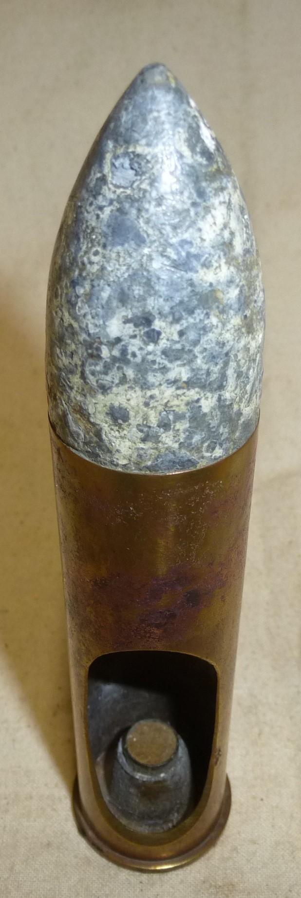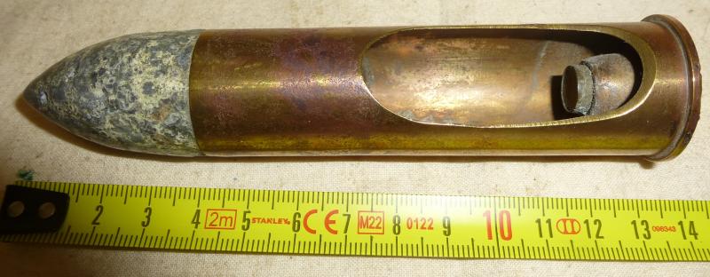 This is a very unusual and possibly rare example of a Morris 1" aiming practice shell. This example has been cut away most likely for instructional purposes of the device. I understand that a tube was inserted into the cannon barrel to reduce calibre to fit this round for cheaper gun training than using full size rounds.