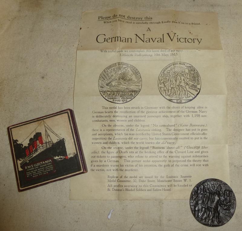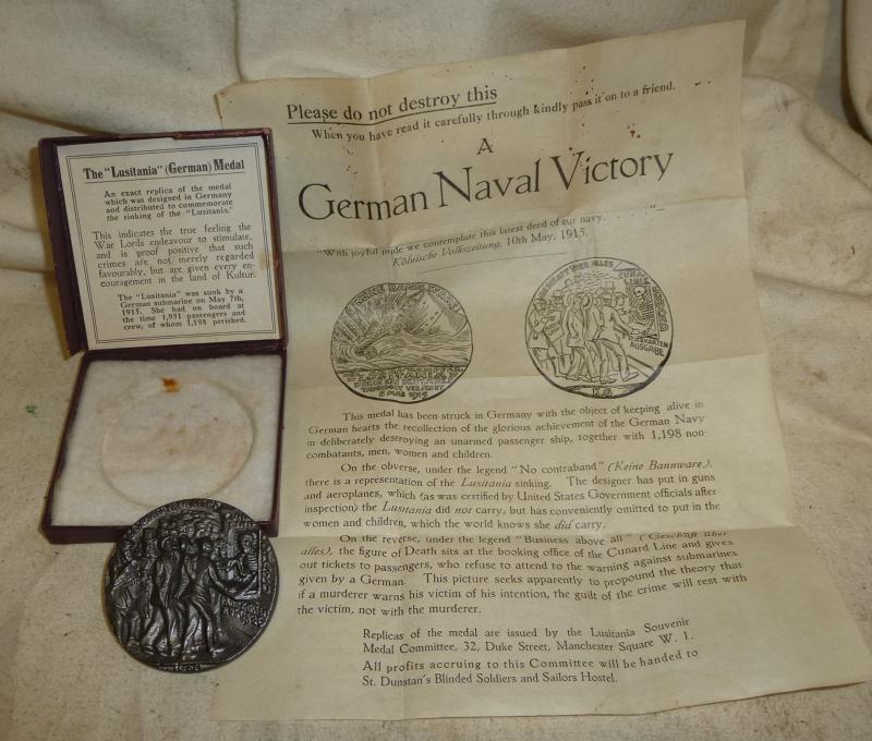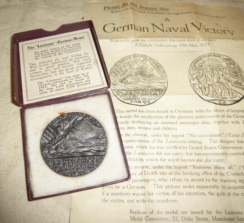 These iron medallions were issued by the British in a counter propaganda exercise roughly copying the German WWI issued medallion to celebrate the sinking of the Lusitania.