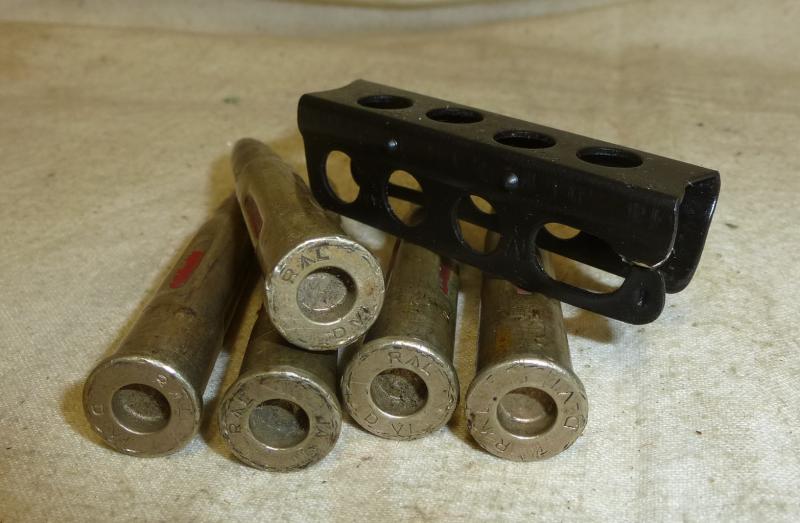 A 5 round clip with genuine WWII period inert training drill rounds All matching marked RL to the base in fair condition for age a nice little set For UK sale only