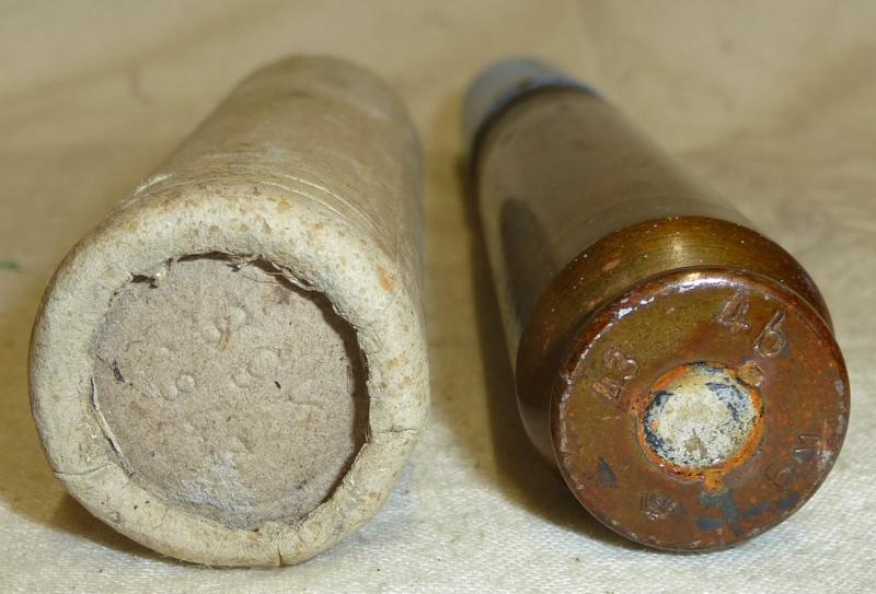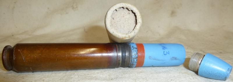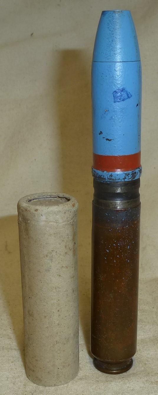 This is a 20mm. MG FF Cannon shell complete with original cardboard transit packaging. The steel case is in superb condition with original laguer. The projectile has bright fresh original colours. The Projectile is an incendiary tracer. Steel case dated 1943 with transit tube marked ggk - 1943.