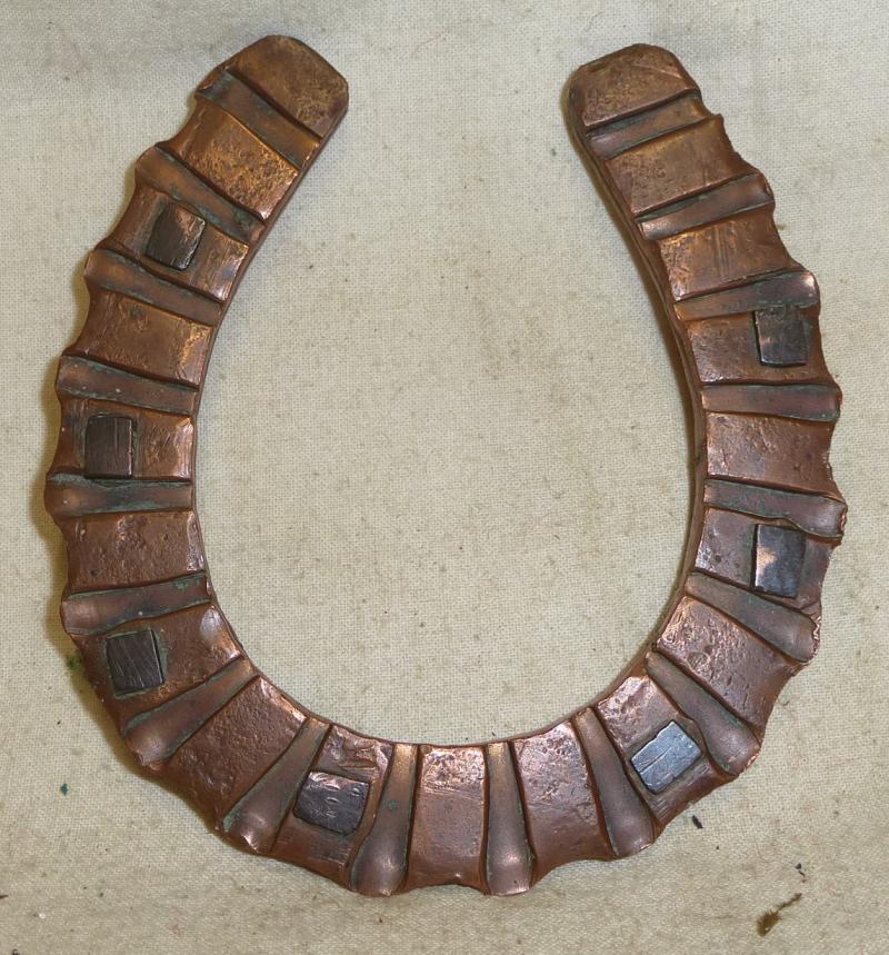 A shell driving band has been used to create this horse shoe it has been made using two pieces with both parts riveted together.