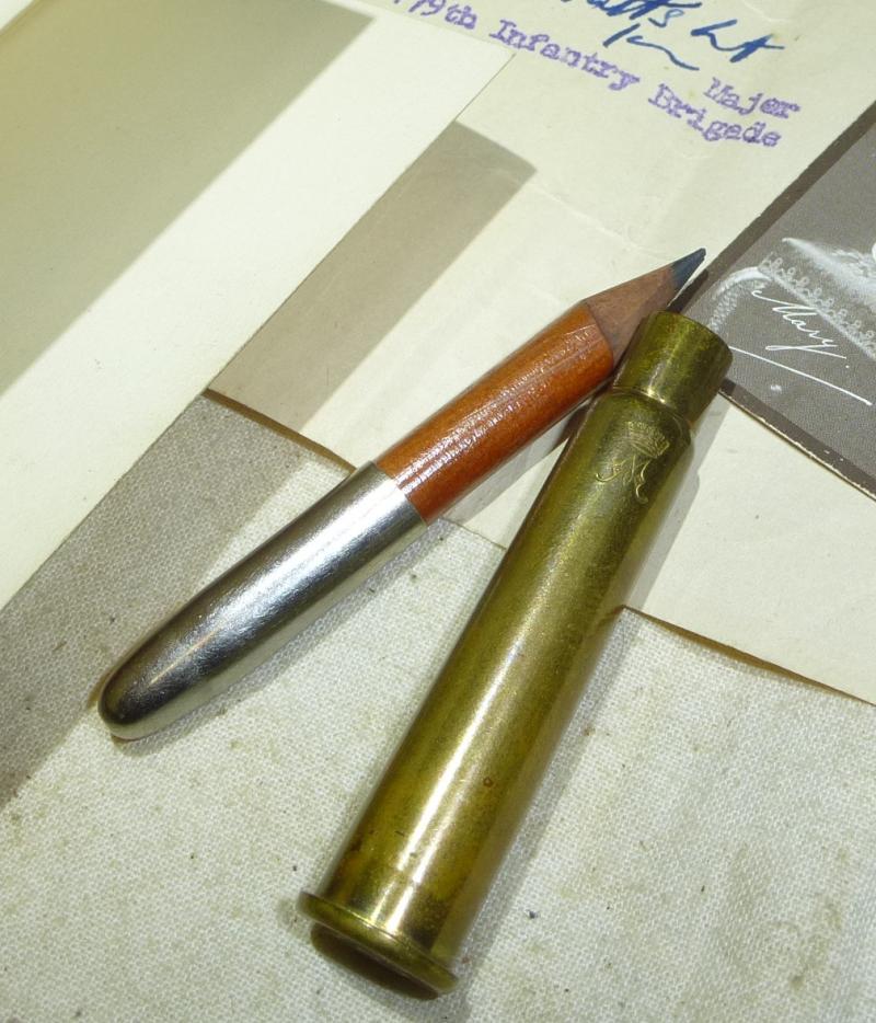 This tin comes complete with its rare and original bullet pencil mounted on its original card piece. The cartridge has the correct "M" Mary monogram and 1914 dated head stamp. The pencil is in unused condition.