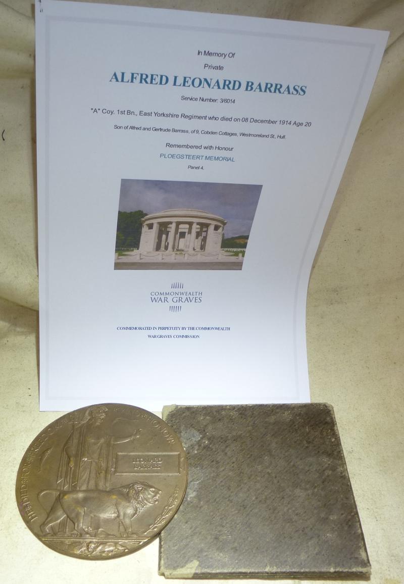 This is a genuine WWI Memorial Plaque, this was dedicated to the loss and memory of Alfred Leonard Barrass of "A" Coy. 1st Battalion East Yorkshire Regiment. Killed in action on the 8th December 1914 aged 20.